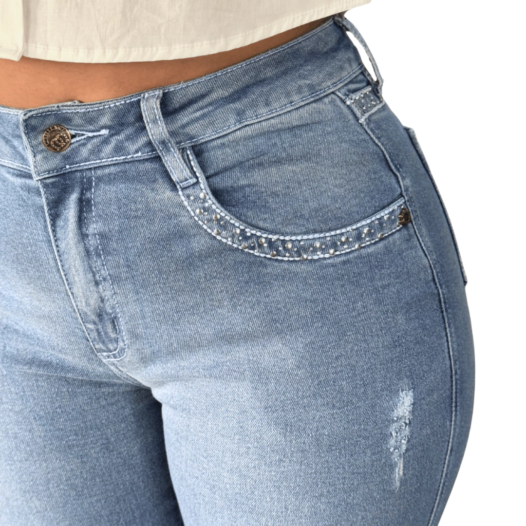 Os detalhes em strass nos bolsos e nas barras e a delicada costura branca trazem um toque de sofisticação ao visual. Combine com suas blusas favoritas e destaque-se em qualquer ocasião.