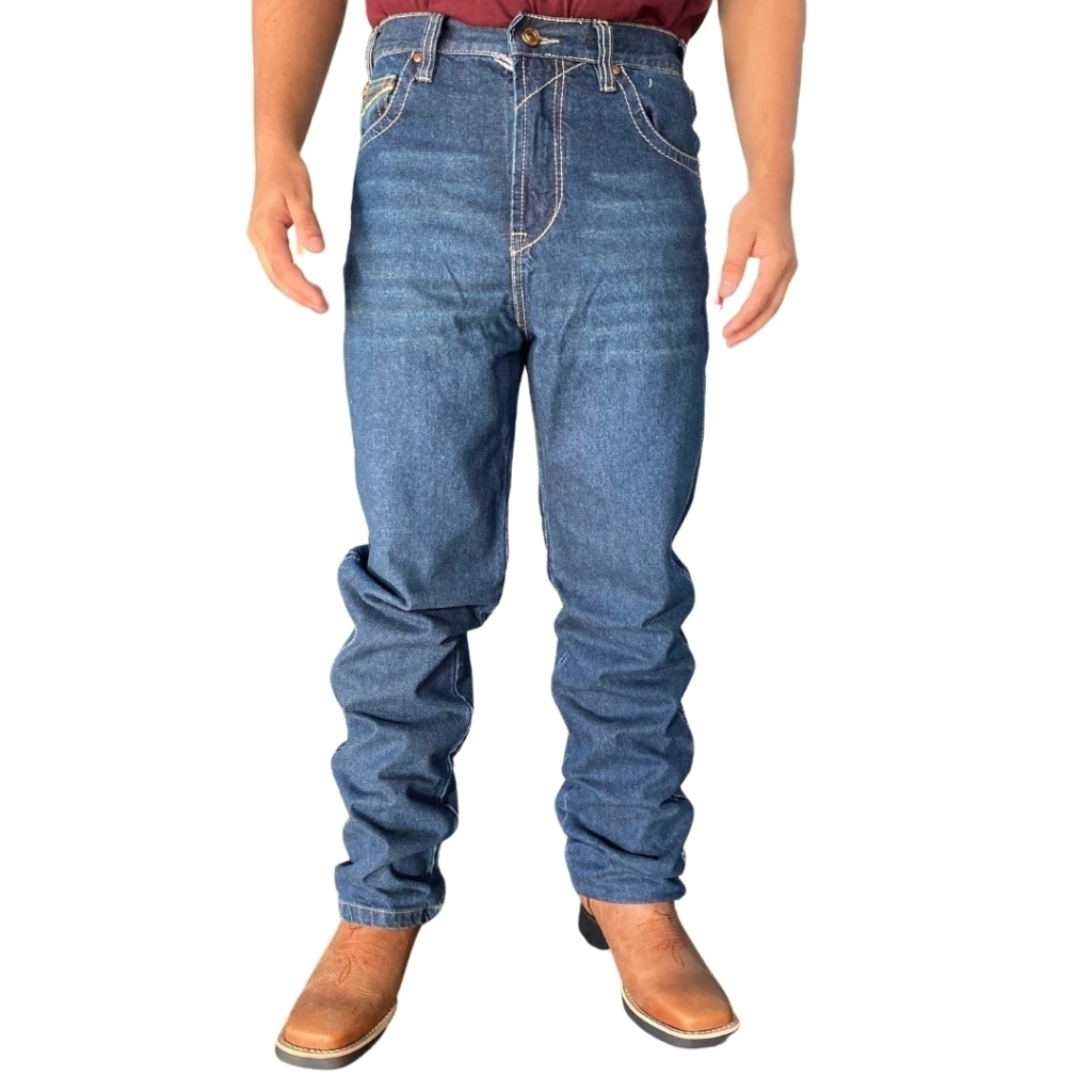 Construção: Confortável com ótima durabilidade, cintura e quadril relaxados, cós alto, joelhos e coxas mais soltos e perna levemente afunilada, etiquetas, botões e rebites personalizados, Acabamento premium