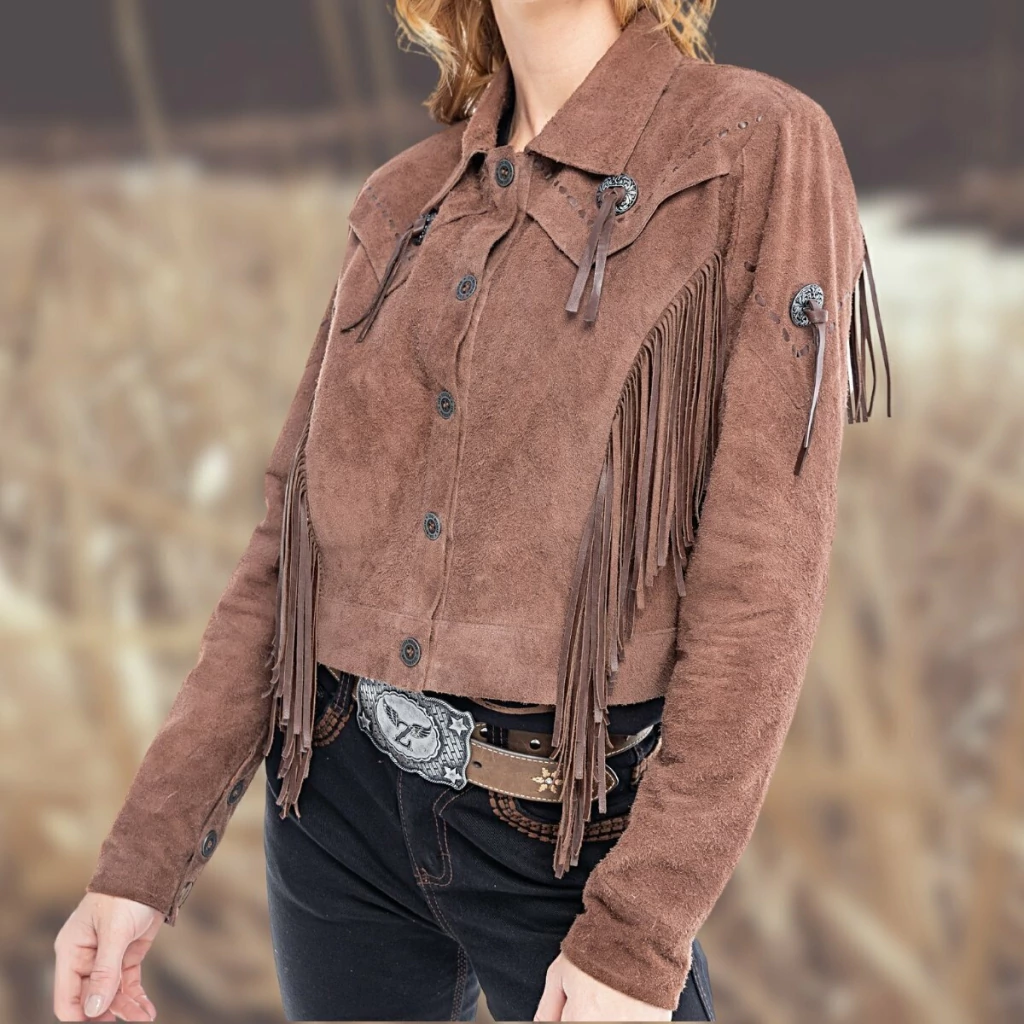 Os detalhes são o que fazem essa peça brilhar: a aplicação de conchos de metal prata velho nas mangas e pala, além das franjas na frente e costas, conferem um toque ousado e moderno. O fechamento de vista e os punhos com botões de casear personalizados garantem um ajuste perfeito e um visual sofisticado.