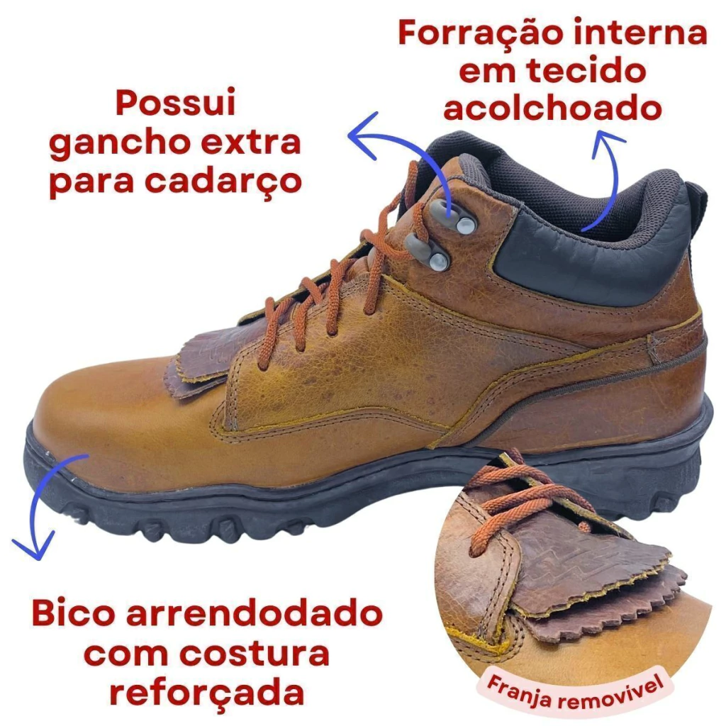 O bico arredondado com costura reforçada garante durabilidade, enquanto o solado em borracha antiderrapante oferece estabilidade em qualquer superfície. Para um visual ainda mais versátil, a franja removível permite que você personalize seu estilo.