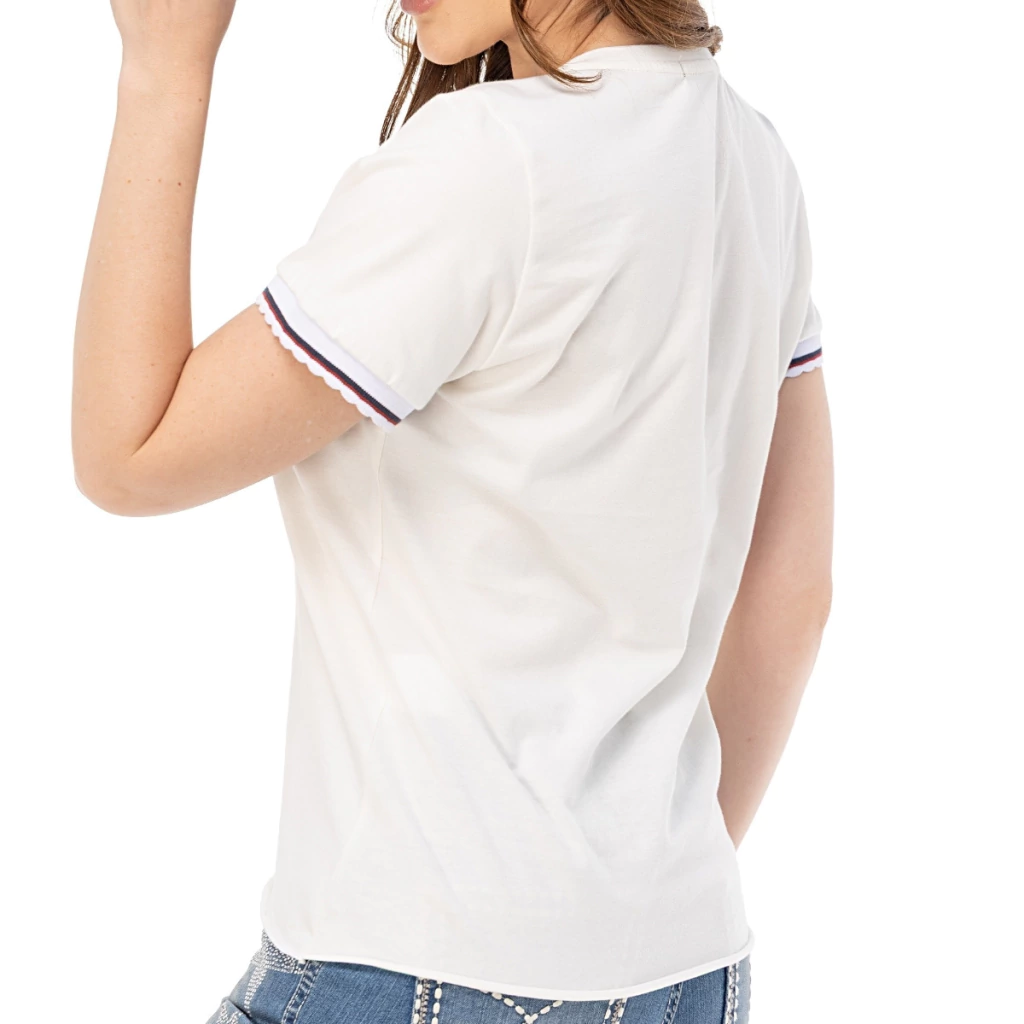 Sua modelagem acinturada valoriza a silhueta feminina, enquanto a gola redonda proporciona um caimento clássico e elegante. O acabamento das mangas em ribana, com detalhes nas cores azul e vermelho, adiciona um charme sutil e diferenciado à camiseta.